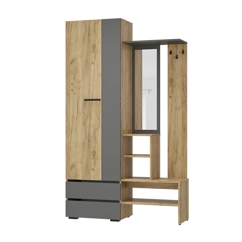 Этот стеллаж со шкафом в прихожую комнату станет отличным элементом для вашего интерьера. Мебель для дома обеспечивает удобное хранение перчаток, шапок, зонтов, сумок и других аксессуаров. Комплект включает шкаф для верхней одежды и настенную тумбу с зеркалом. Закрытые дверцами модули гарантируют порядок в коридоре.