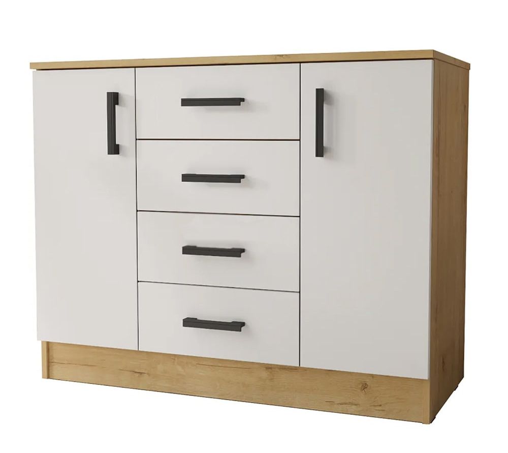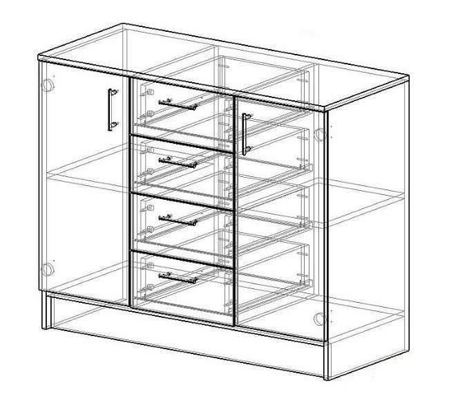 Функциональный комод вместителен. Конструкцией предусмотрены четыре выдвижных ящика с роликовыми направляющими и дверцы, за которыми расположены полки.