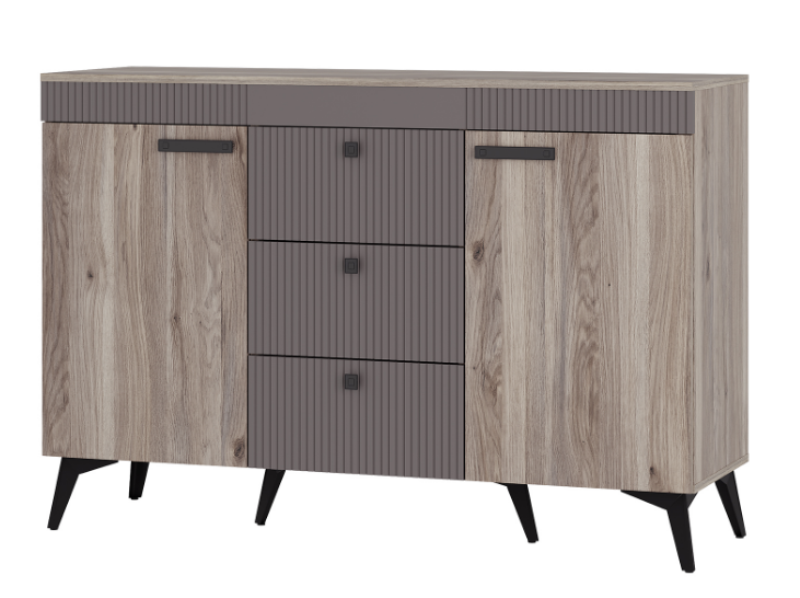 Комод «Кассандра» состоит из трёх вместительных зон: 2 боковые зоны с полками, а центральная состоит из трёх ящиков, в которых удобно хранить постельное бельё и мелочи.